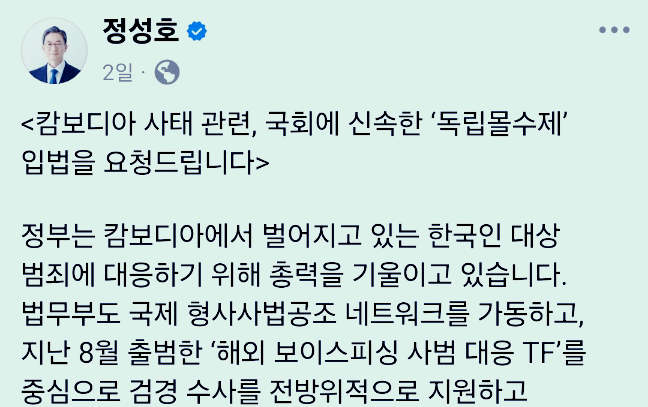 정성호 법무부 장관이 <캄보디아 사태 관련, 국회에 신속한 ‘독립몰수제’ 입법을 요청드립니다>라는 공식 입장을 냈다. 핵심 내용은 아래와 같다.