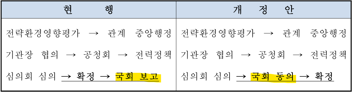 개정안은 전력수급의 기본방향 및 장기전망, 발전설비 및 주요 송·변전설비 계획에 관한 사항이 국민생활 및 국가경제에 미치는 영향이 크기 때문에 국회 동의 후 확정되는 것이 타당하다는 취지다. 현행 절차와 개정안에 따른 절차를 비교해보면 아래 <그림>과 같다.