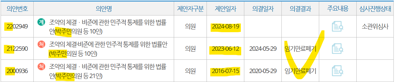 박주민 의원이 발의한 「조약의 체결·비준에 관한 민주적 통제를 위한 법률안」과 여러명의 의원이 발의한 「통상조약의 체결절차 및 이행에 관한 법률 개정안」을 말한다. 박주민의 법안 중심으로 살펴본다.