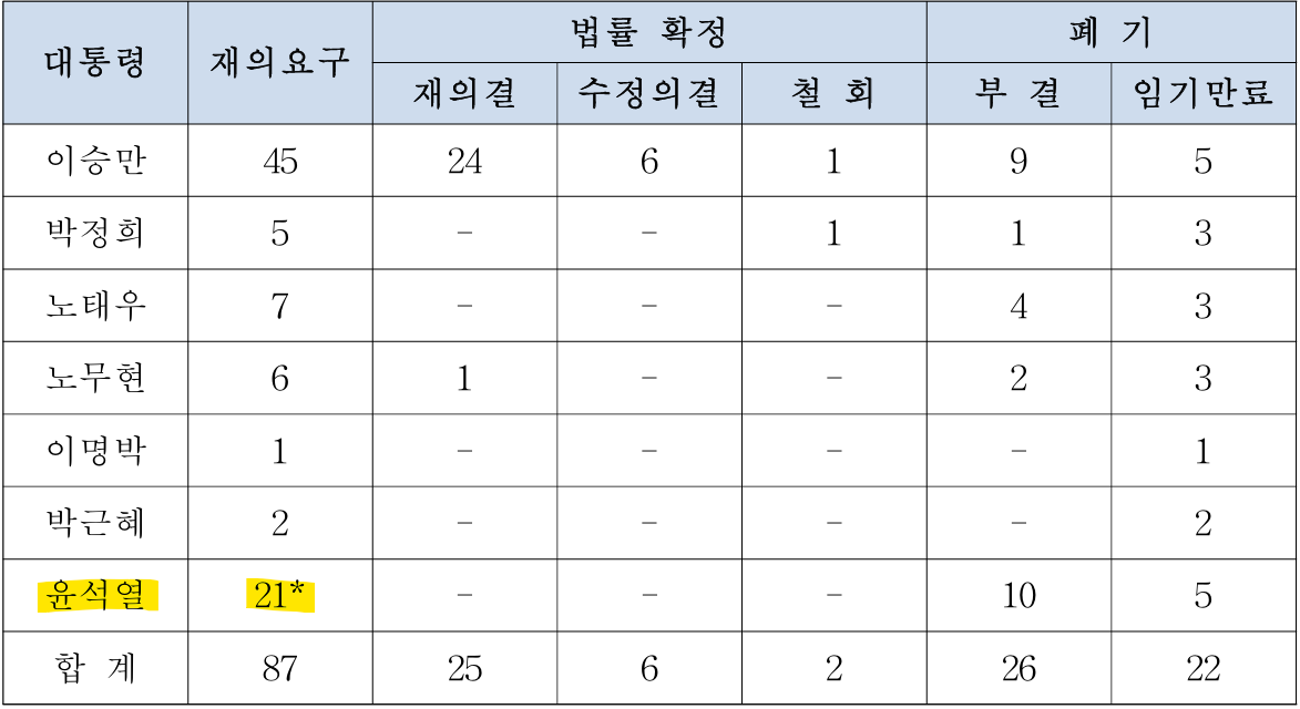 대통령의 거부권 행사가 이례적인 경우면 별 문제가 없었을텐데, 이게 너무 많다보니 뭔가 제도적 정비 필요성이 제기되는 것이다. 이 법안은 대통령 거부권 행사 기준과 재의요구 회피 의무 등을 법률에 규정하여 헌법상 해석 논란과 이해충돌 소지를 정리하고자 하는 취지로 볼 수 있다.