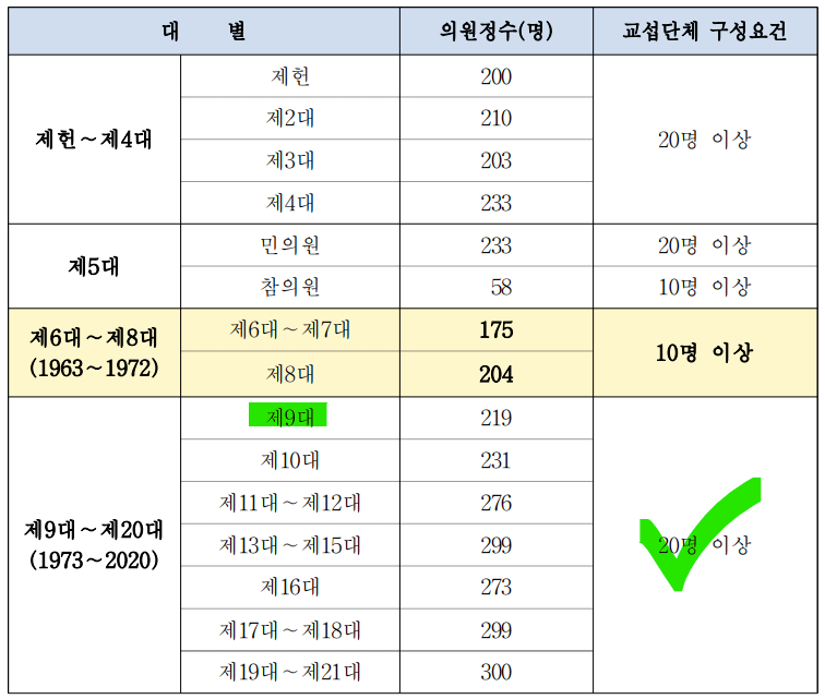 특별한 이유나 객관적인 기준은 없다. 국회에서 결정하기 나름이다. 과거 연혁을 보면 제5대 국회까지는 20명 이상었다가, 6대에서 8대까지는 10명 이상으로 완화되었다. 그러다가 제9대 국회(1973년)부터 다시 20명 이상으로 바뀌어 현재에 이르고 있다.