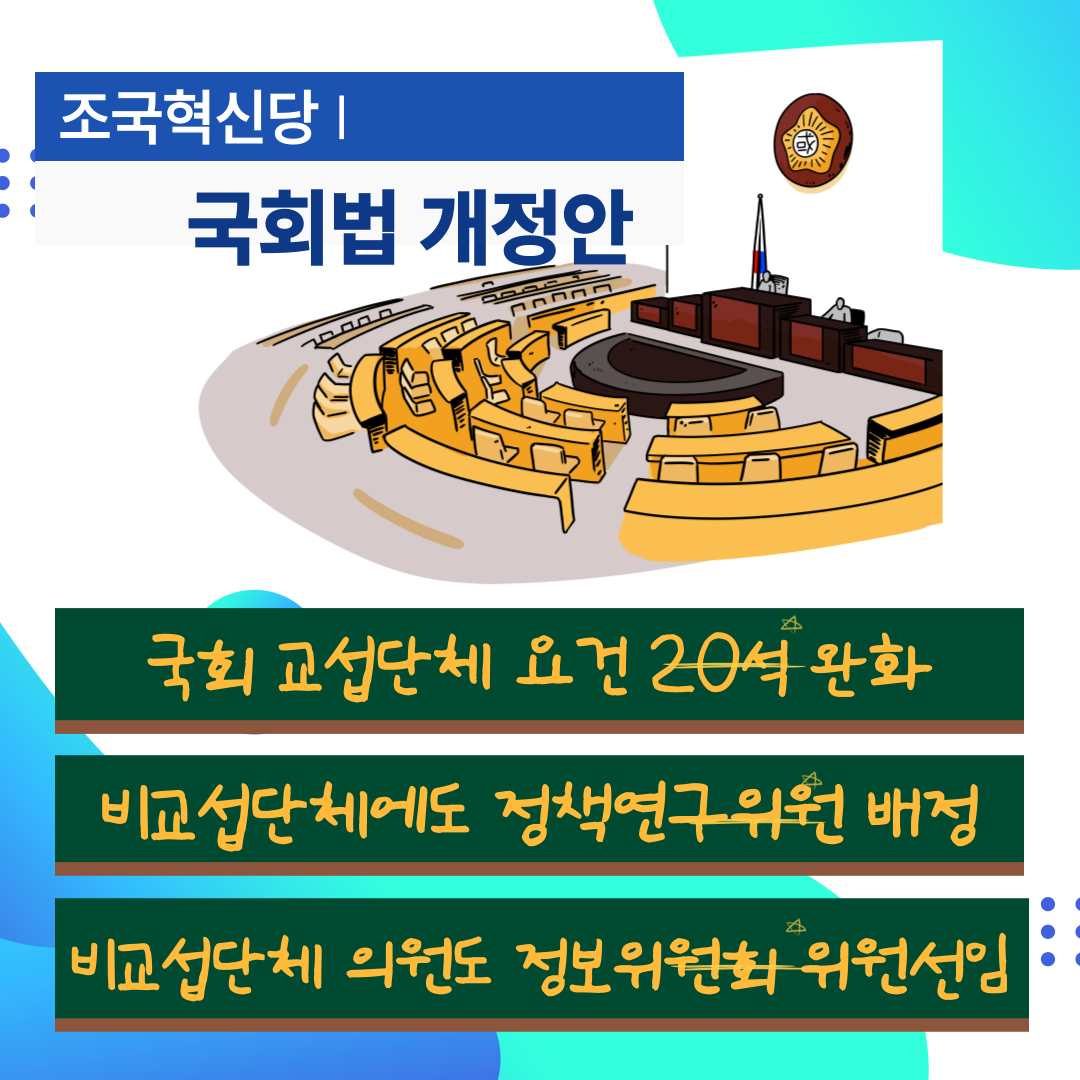 조국혁신당이 발의한 국회법 개정안은 ①교섭단체 요건 20석→10석 완화(정춘생) ②비교섭단체에도 정책연구위원 배정(서왕진) ③비교섭단체 소속 의원도 국회 정보위원회에 배정(김준형)될 수 있도록 하자는 것이다.