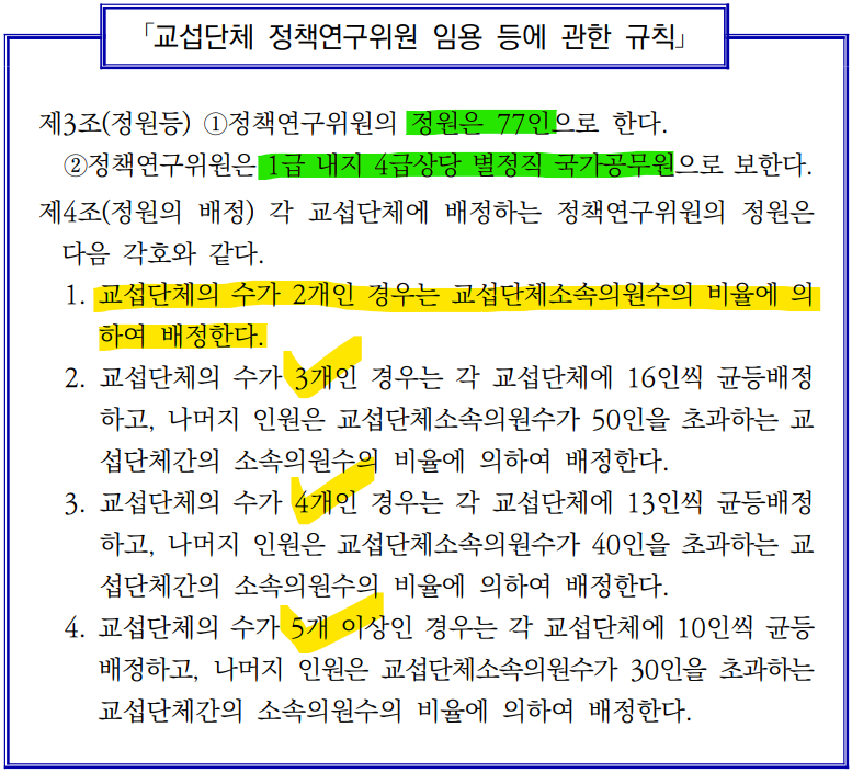 정책연구위원이라는 것이 좀 생소할텐데, 쉽게 말하면 국회의장이 임명하지만 실제로는 정당을 위해서 일하는 사람들이다. 국회법 제34조( 입법활동을 보좌하기 위하여 교섭단체에 정책연구위원을 둔다.)에 근거하여 이들의 법적 지위는 국가공무원이지만, 실제로는 정당의 고위급 당직자로 보면 된다. 정책연구위원의 인원‧자격‧임면절차‧직급 등은 「교섭단체 정책연구위원 임용 등에 관한 규칙」으로 정하고 있다.