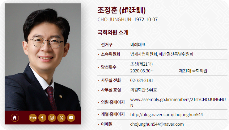 조정훈 국회의원은 국민의힘 '현역 1호 영입인재'다. 원래는 '시대전환' 소속이었다. 22대 총선에서 민주당 영입인재 이지은 전 총경을 상대로 서울 마포갑에서 경쟁했다. 48.3% 득표로 당선되었다.