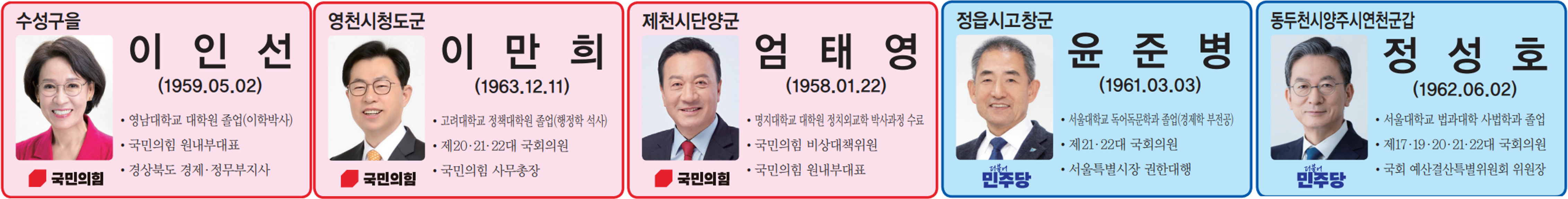 | 4건 | 구자근, 김상훈, 김정재, 문진석, 박수민, 박희승, 서천호, 송석준, 임오경, 조지연 |