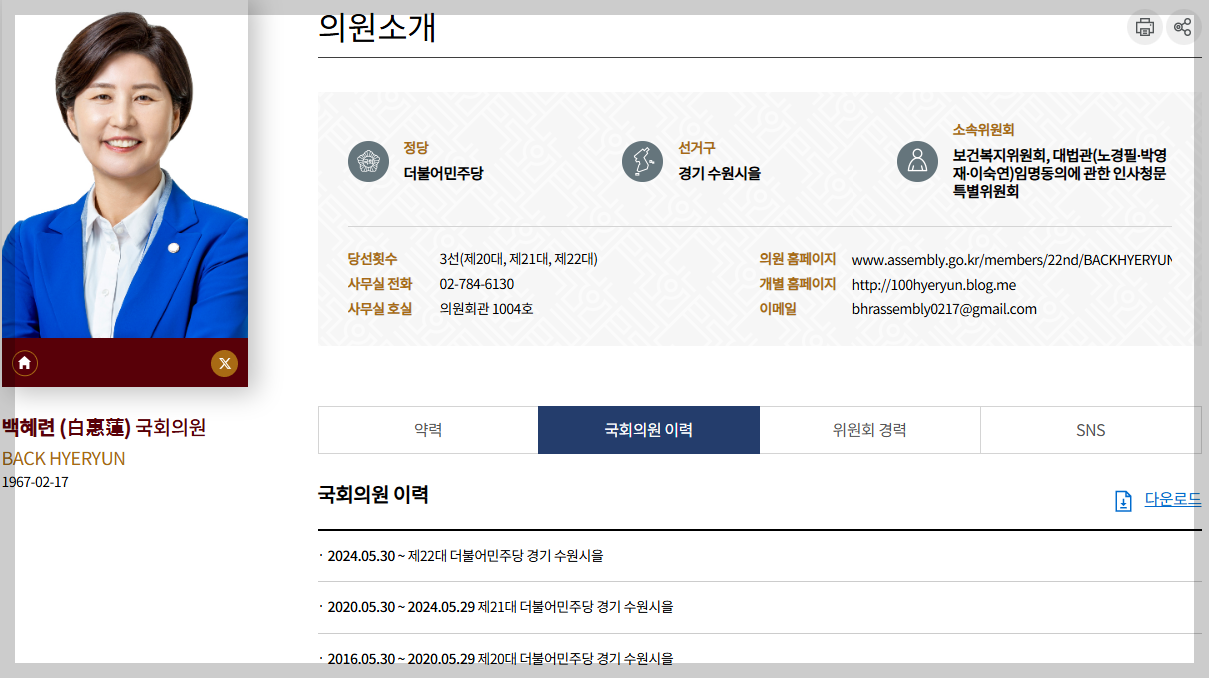 백혜련 의원 프로필_출처: 대한민국국회 홈페이지