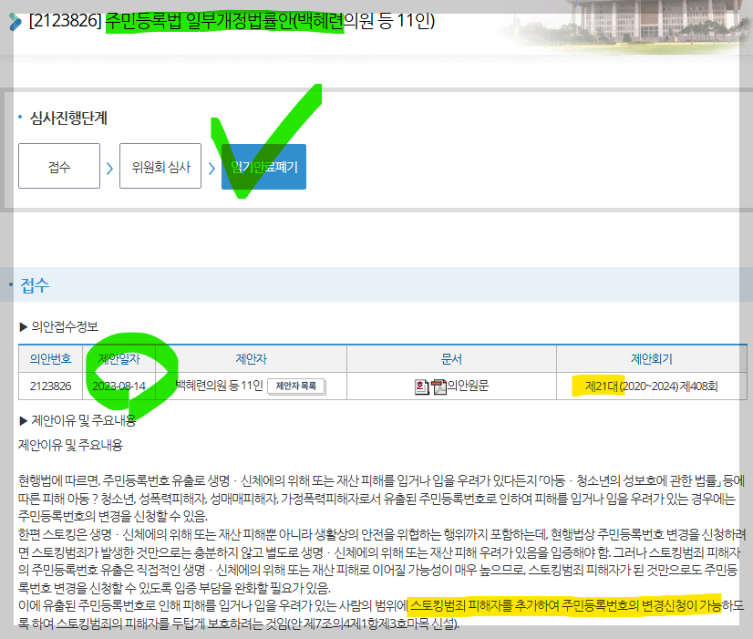 백혜련 의원이 발의한 「주민등록법」 개정안은 현행 주민등록번호 변경 신청 요건에 「스토킹범죄의 처벌 등에 관한 법률」에 따른 피해자를 추가하는 것이다. 스토킹 범죄가 급증하고 있고, 스토킹 범죄 피해자 보호 차원에서 마땅히 필요한 조치라고 생각된다.