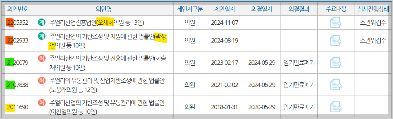 앞서 설명한 것처럼 주얼리산업 진흥법안은 20대국회부터 발의되었으나 처리되지 못하고 폐기되었다.