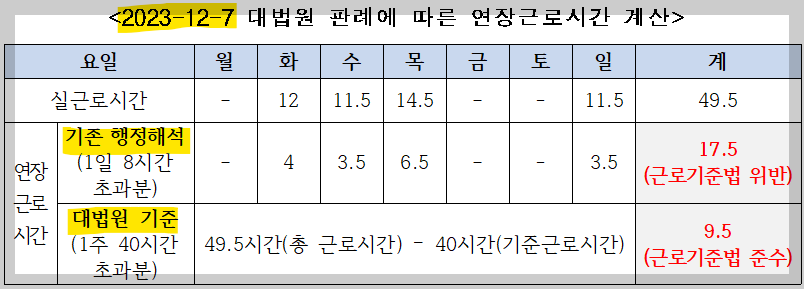 원래 노동부는 1일 8시간을 초과하는 근로시간을 모두 연장근로시간으로 보아 근로기준법 위반 여부를 판단했는데, 2023-12-7 대법원은 1일 기준이 아니라 1주간의 근로시간 중 40시간을 초과하는 근로시간을 기준으로 판단해야 한다고 판결했다. 대법원 판결에 따라 노동부는 연장근로시간 위반 기준에 대한 행정해석을 변경했다.