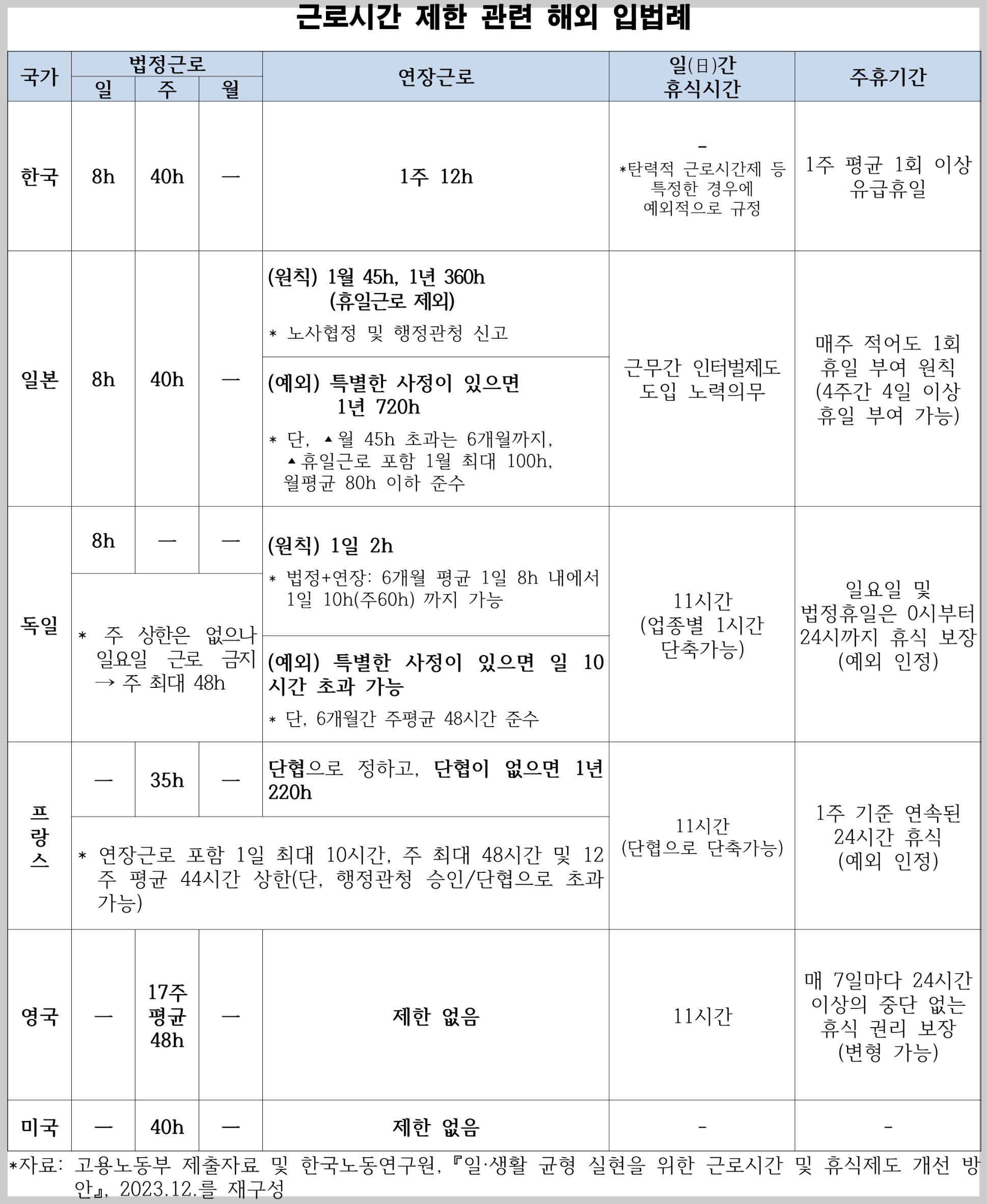 해외 사례를 보면, 연장근로 제한과 관련하여 독일과 프랑스는 1일 최대 근로시간 상한을 두고 있고, 일본은 연·월단위 연장근로 제한을 두고 있으며 영국과 미국은 연장근로와 관련한 별도의 규제가 없다.