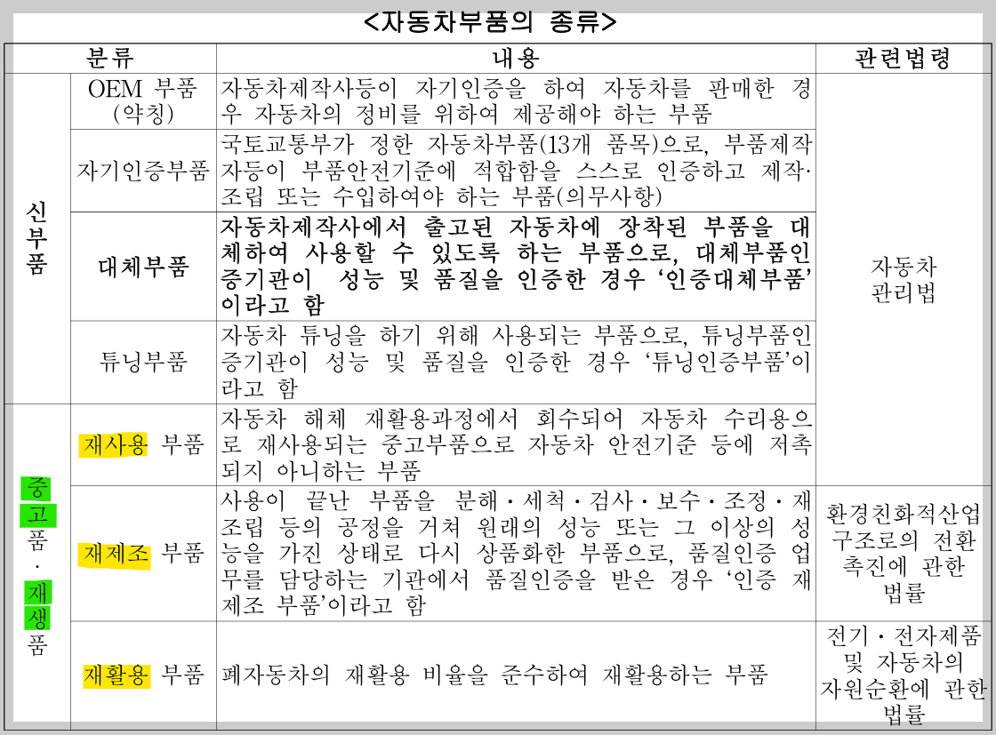 현행 자동차 관리법에서는 자동차 정비업자는 정비 의뢰자에게 신부품, 중고부품, 재생부품을 선택할 수 있도록 알려주도록 하고 있으며, 중고·재생품을 사용해 정비할 경우 그 이상 여부를 확인하도록 하고 있다.