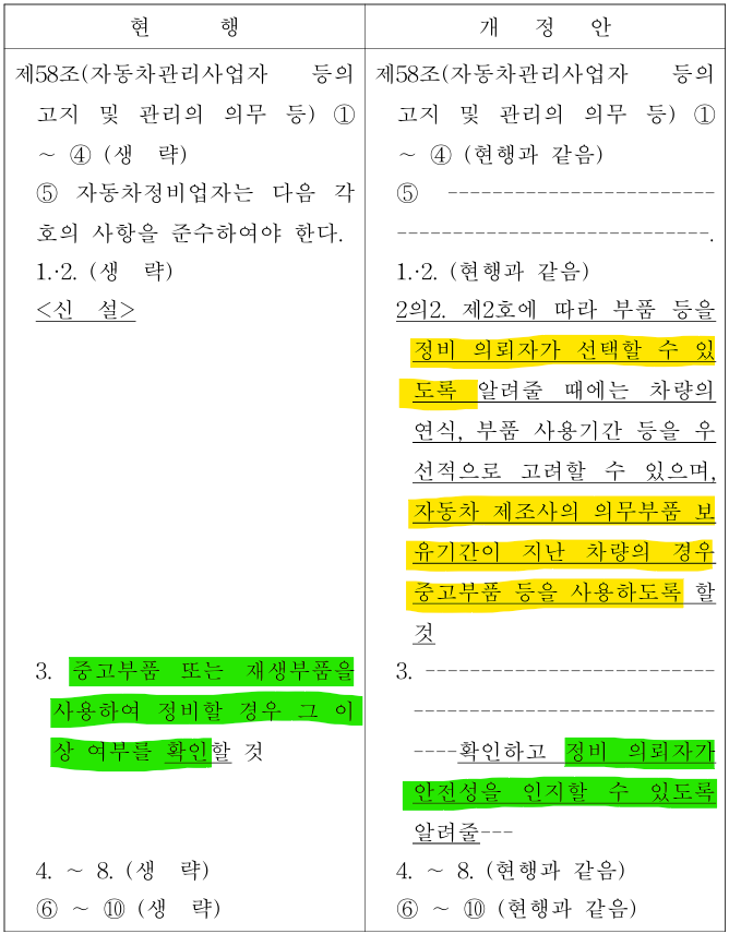 간단히 요약하면, 정비업자가 의뢰자에게 중고·재생부품을 선택할 수 있도록 권유하는 것을 법률에 명시하는 것이다.