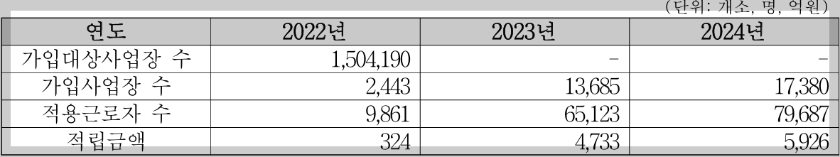 가입 실적은 그리 많지 않다. 2024년 기준 가입 사업장은 17,380개소, 적용근로자 수는 8만여명, 적립액은 5,926억원이다. 2022년 기준 가입 대상 사업장 수가 1,504,190개소 임을 고려하면 매우 저조한 편이다. 제도가 도입된지 얼마 되지 않은 이유도 있을 것이다.