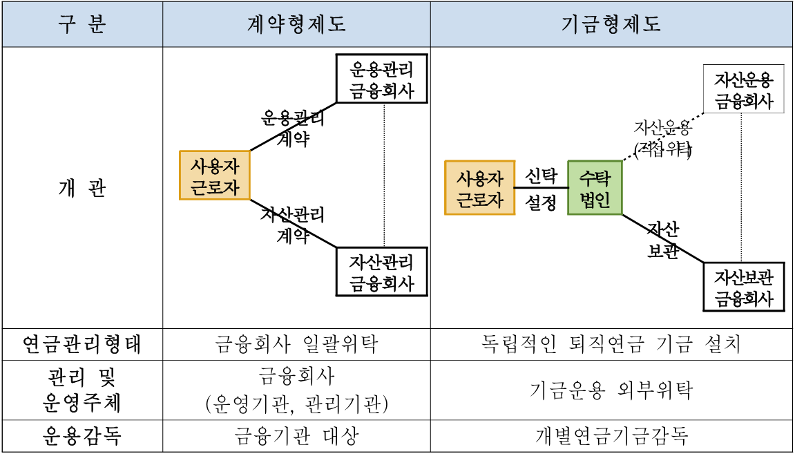 퇴직연금 제도는 근로자 재직 기간 중 사용자가 사외(社外)에 근로자의 퇴직급여를 금융기관에 적립하고, 이 적립금을 사용자 또는 근로자가 운용하다가 55세 이후에 연금 또는 일시금으로 수령할 수 있도록 하는 제도다. 위 <표>에서 보는 것처럼 여러 유형이 있다.