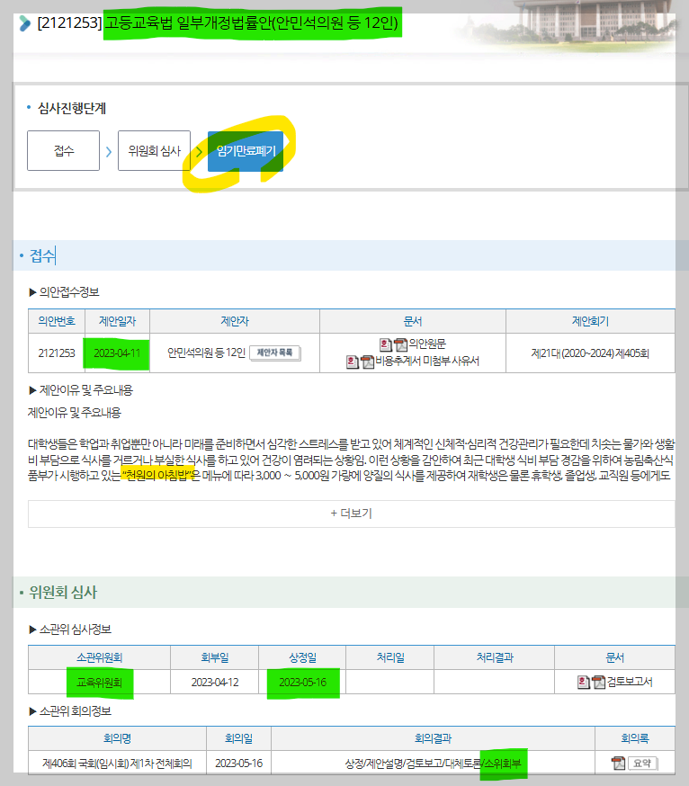 21대 국회에서 '천원의 아침밥' 법제화를 위한 고등교육법 개정안(안민석 발의)은 어떻게 되었을까? 임기만료와 함께 폐기되었다. 이 개정안은 2023년 5월 16일에 소위원회에 회부된 이후 단 한번도 논의되지 못했다.