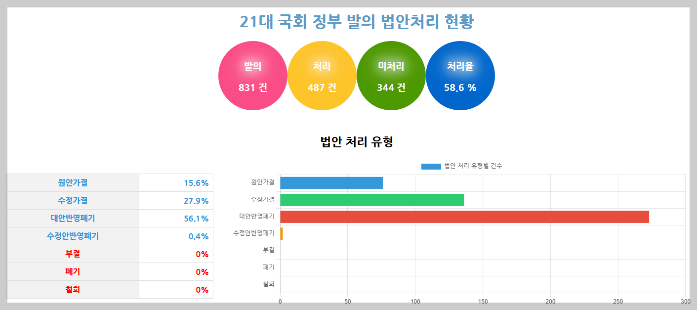 21대 국회에서 정부가 직접 발의한 법안은 고작 831건이다. 21대 국회 전체 발의 법안 25,818건의 3.2%다. 487건 처리 법안 기준으로 보면, 전체 처리안건 9,453건의 5.2%에 해당된다. 그런데 공공연한 청부입법의 관행을 고려하면, 실제 발의 및 처리 안건의 상당수가 '청부입법' 방식을 거쳤을 것으로 추정된다. 청부입법이냐 아니냐를 구분할 수 있는 기준은 공식적으로는 없다. 보통 음지에서 비공식적으로 이루어진다.