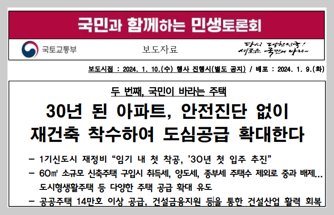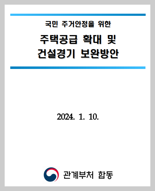 정부는 2024년 1월 10일, 관계부처 합동으로 「국민 주거안정을 위한 주택공급 확대 및 건설경기 보완방안」 정책을 발표했다. 윤석열 대통령의 '민생토론회' 이벤트의 일환이었다.