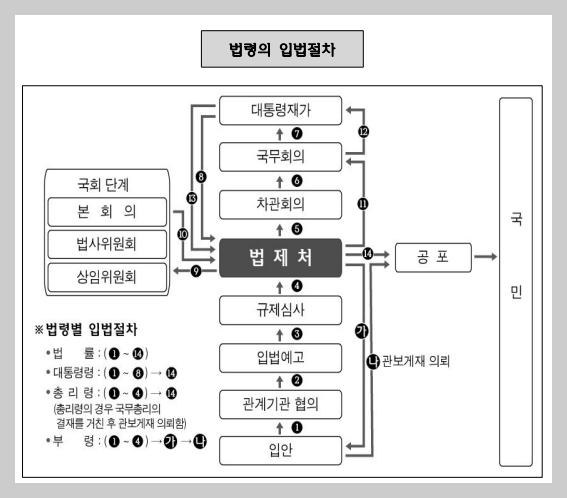 입법계획 수립 → 법령안 입안 → 관계부처 및 당정협의 → 입법예고 → 규제개혁위원회 심사 → 법제처 심사 → 국무회의 → 대통령 재가 → 국회 제출