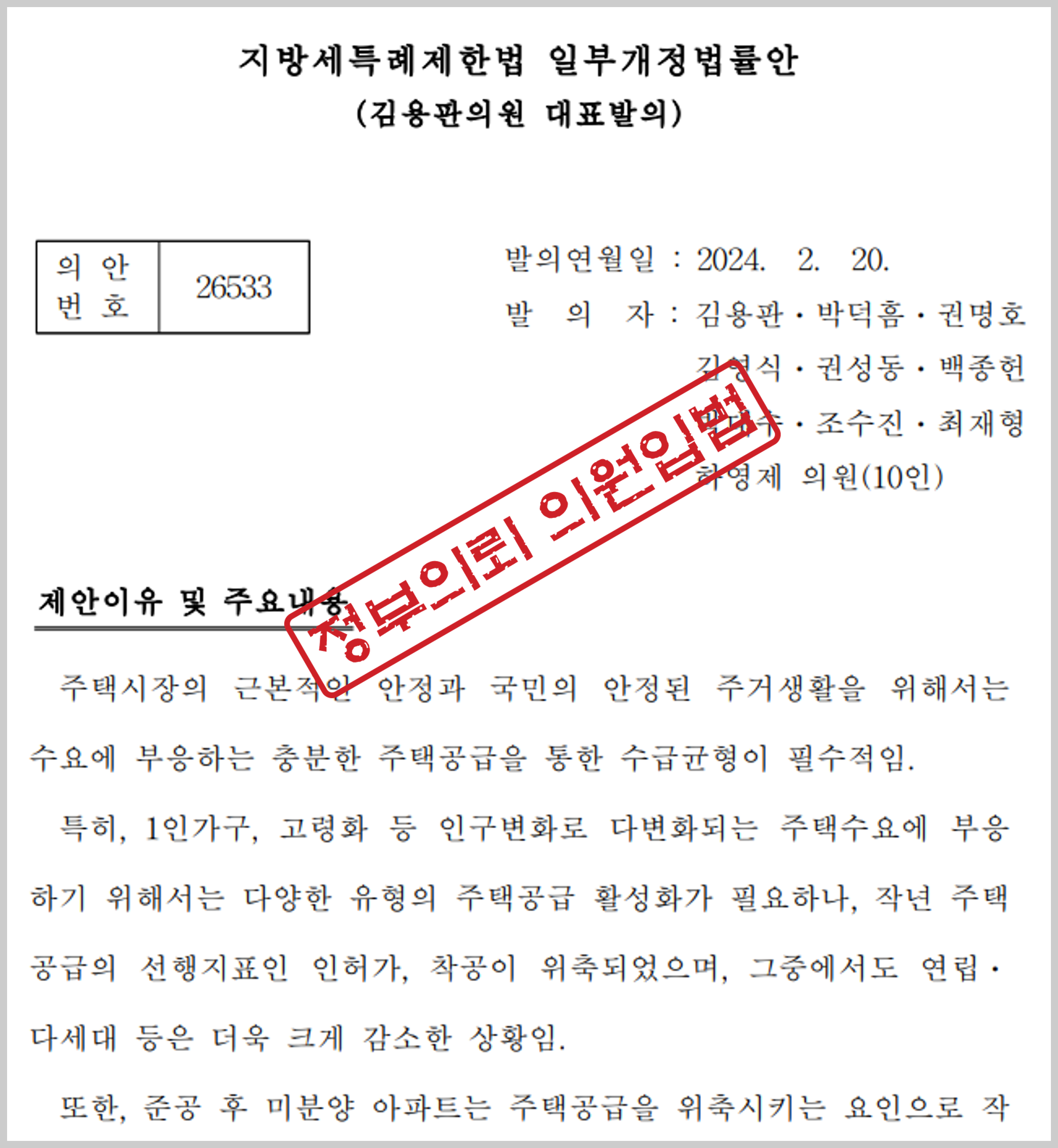 김용판 의원은 2024년 2.20일 「지방세특례제한법 개정안」을 발의했다. 주요 내용은 향후 2년간 신축 소형주택의 취득세 경감, 지방 준공 후 미분양 주택을 임대주택으로 활용 시 취득세 경감, 캠코(한국자산관리공사) 참여 프로젝트금융투자회사의 사업장 매입시 취득세 감면 등이다. 이 내용은 앞서 설명한 '국민 주거안정을 위한 주택공급 확대정책(2024년 1.10일 발표)' 내용과 동일하다.