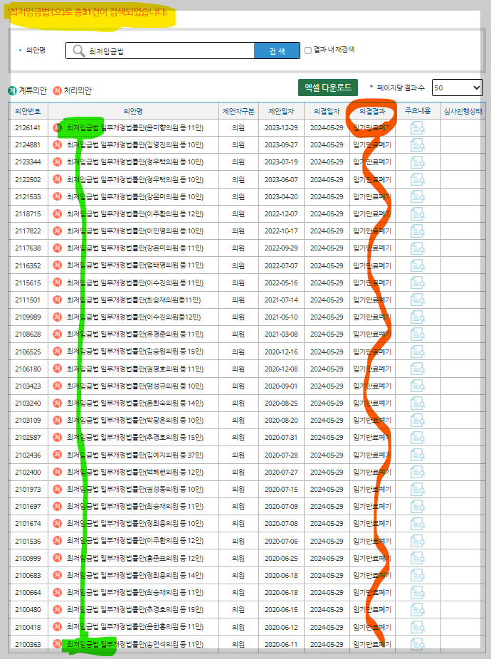 그런데 참 재미있는 현상이 하나 있다. 지난 21대국회에서도 「최저임금법」 개정안이 31건이나 발의되었는데, 특이하게도 단 1건도 처리되지 못했다는 것이다. 전량폐기되었다.