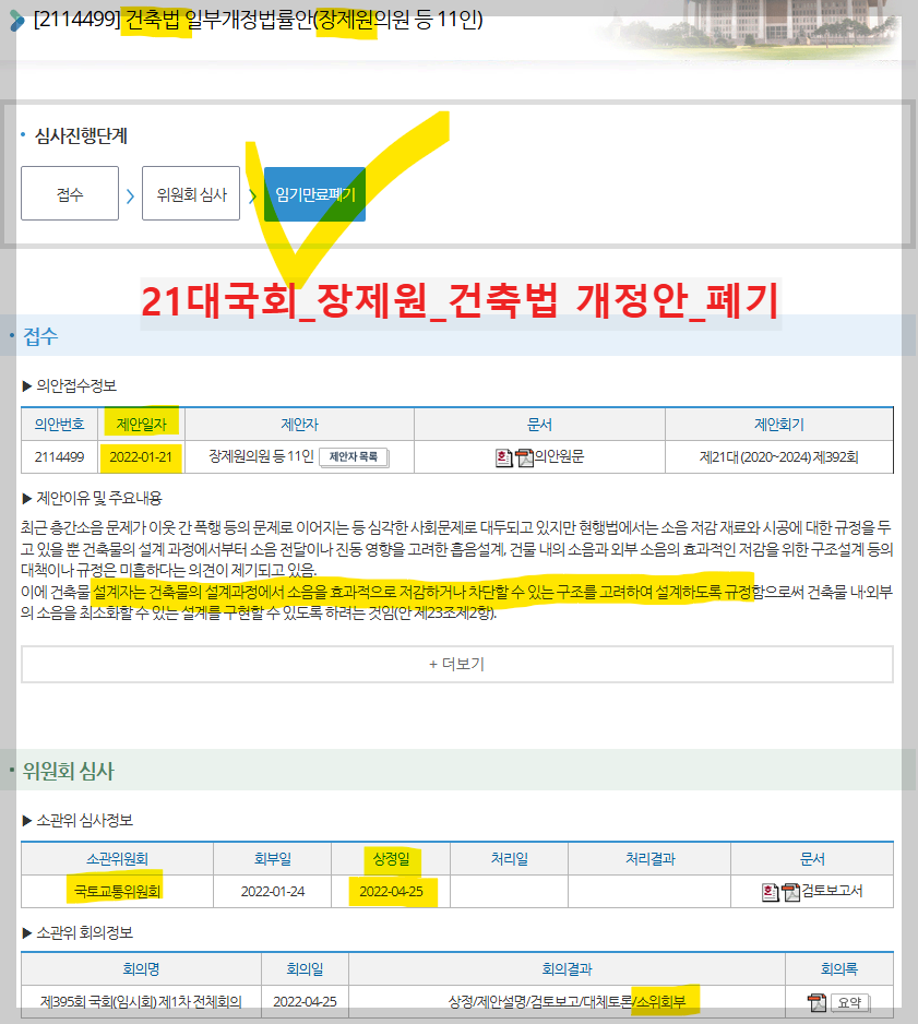 장제원 의원의 「건축법」 개정안은 2022년 1월 21일에 발의되었고, 이후 충분한 시간이 있었음에도 불구하고 소관 국토위에서 소위에 회부만 된 상태로 방치되었다. 그러다가 그냥 폐기되었다. 이 법안에 대해 당시 국토부는 원칙적으로 동의한다는 입장이었다. 그런데, 왜 논의 한번 붙이지도 못하고 폐기되었을까? 아마도 실익이 없는 선언적 규정으로 보았기 때문 아닐까?