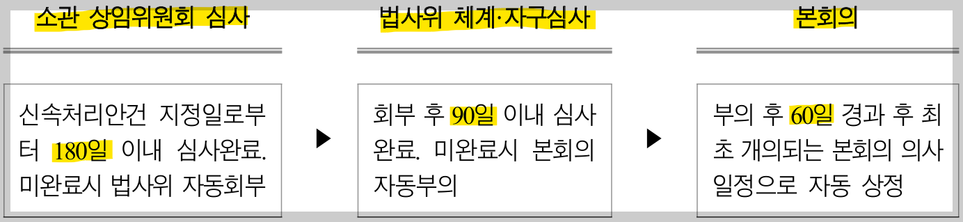 신속처리 대상 안건으로 지정된 이후, 해당 안건이 이 절차에 의존해서 본회의 의사일정에 도달하기까지는 최대 330일이 소요된다. 거짐 1년이다. 신속처리제도가 진짜 신속처리 되는건 아니다.
