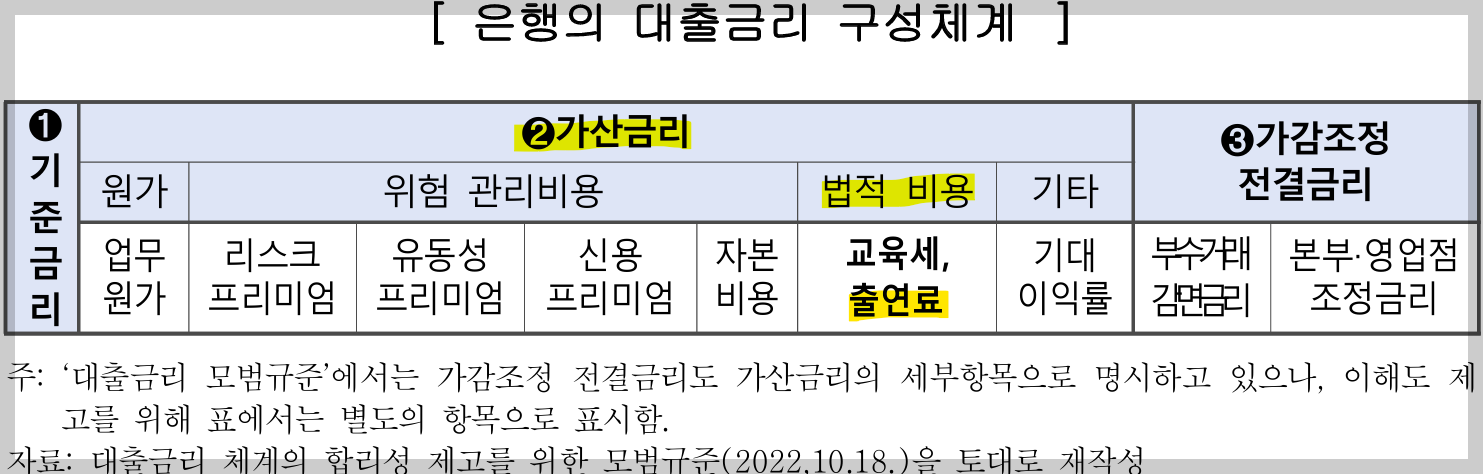 이 개정안 은행의 대출금리 산정방식 중 일부분을 법률로 규제하는 법안이다. 민병덕(안)을 기준으로 보면, 현재 은행이 가산금리 산정에 포함하고 있는 다음과 같은 항목(비용)을 앞으로는 반영하지 못하게 하고 있다.