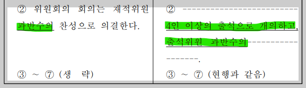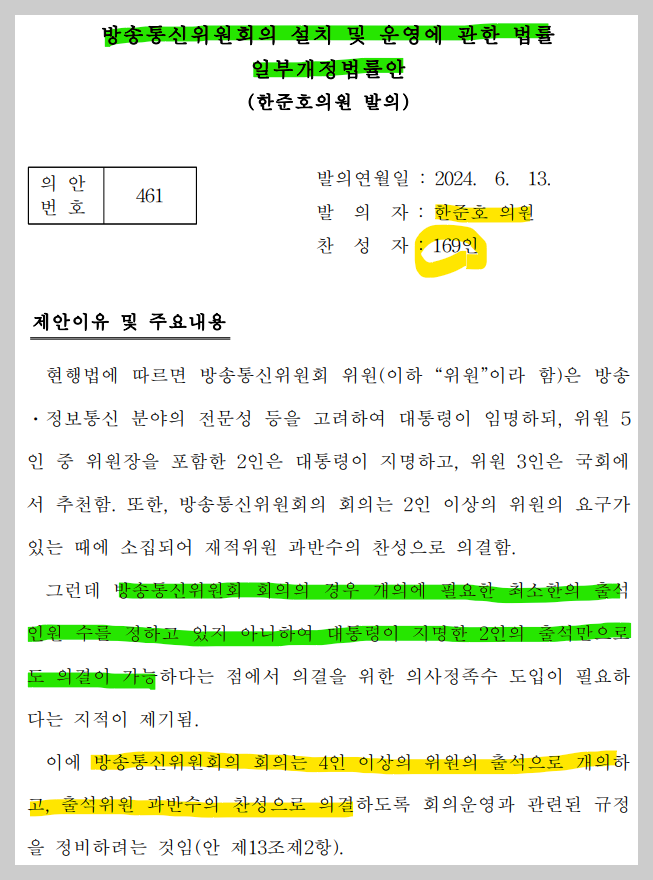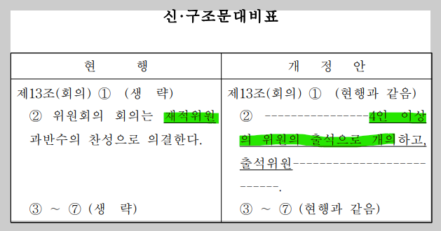 한준호 의원의 법안 제안설명에서 보듯이 동 법률개정안의 개정 내용은 단순하다. 5인으로 구성된 합의제 행정기구인 방통위에서 대통령·여당 측 위원 2명 만으로 중요한 의사결정을 처리하는 기형적 운영을 방지하려는 내용이다.