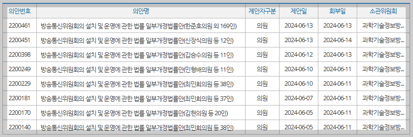신장식 의원이 6.13일 발의한 법안도 앞서 김현 의원이 발의한 법안과 거의 유사하다. 김현 의원이 방통위 회의 개의 정족수를 4인 이상으로 한 것과 비교해 신장식 의원은 3인 이상으로 한 것이 다른 점이다. 개의 정족수를 4인으로 할것니냐, 3인으로 할것이냐는 위원회 심의를 통해 정하면 되는 것이지, 굳이 법안을 새로 발의할 필요는 없다. 제척·기피 위원을 재적위원 수에서 빼는 내용도 있긴 하지만 굳이 법률에 명시할 내용인지 의문이다. 22대 국회에서도 선행 발의 법안과 유사한 법안들이 '입법실적 늘리기' 용도로 수없이 발의될 것이다. 안타깝지만...