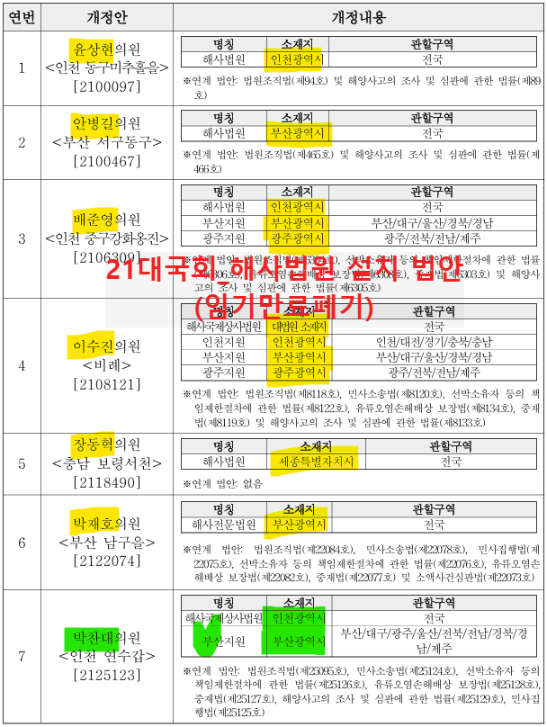 지역구 국회의원이 자기 지역을 위해 일하는 것은 당연한 것이다. 그런데 수요자 측면에서의 편의성이나 국가적 차원에서의 효율성과 무관하게 무조건 자신의 지역에 설치해야 한다며 다투는 모습이 썩 보기 좋지는 않다. 그건 그렇고 지난 21대 국회에서도 해사법원 신설을 위해 많은 법안이 발의됐지만 결국 모두 폐기됐다. 21대 국회 법안 발의 현황은 아래 <표>와 같다.