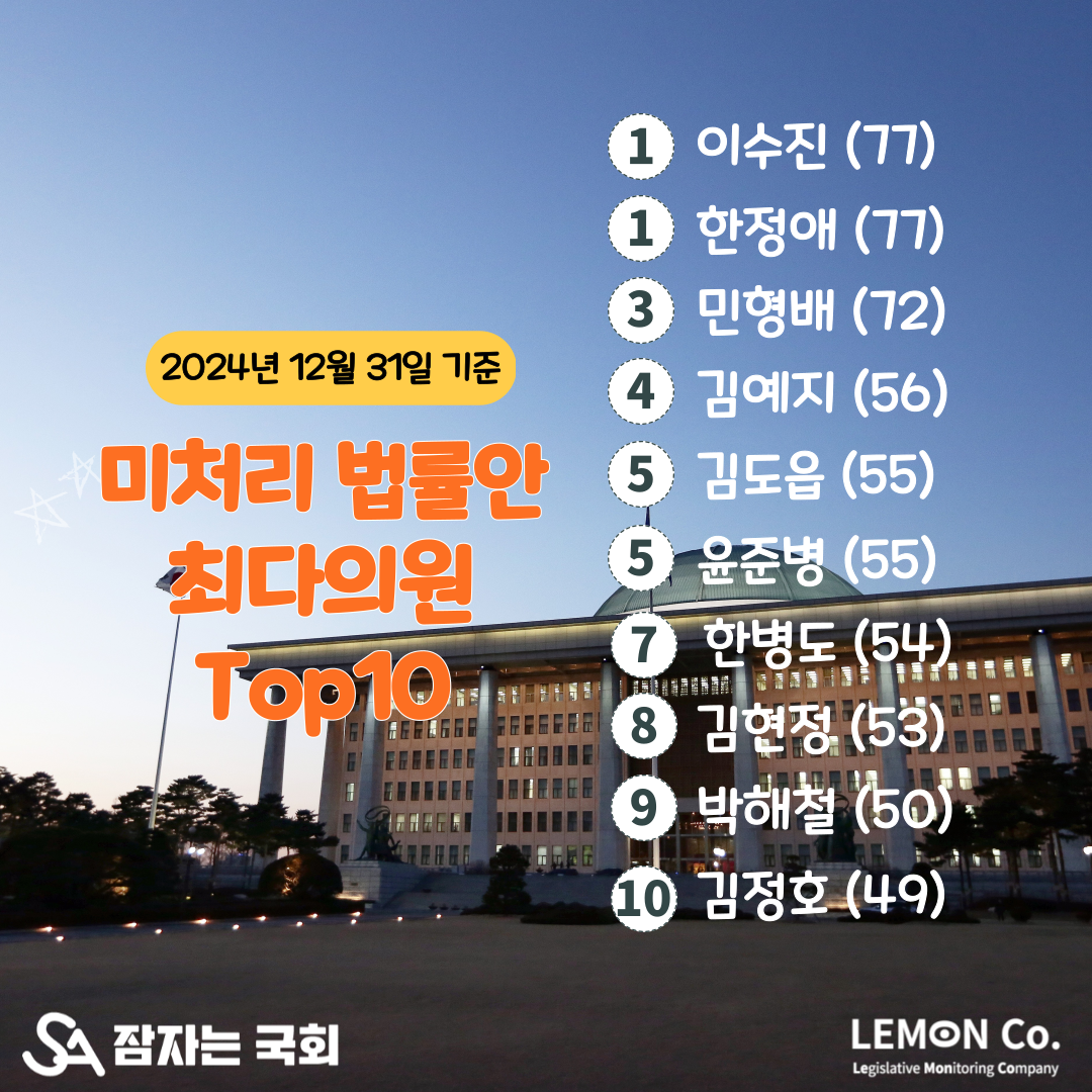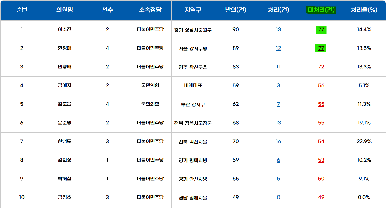 보통 언론에서 법안 발의 최다의원이 누구인지를 다루곤 한다. 잘못된 접근이라고 생각한다. 발의 건수로 국회의원의 의정활동을 평가하는 것은 국회의원들이 별 의미없는 법안을 남발하게 할 뿐이다. 「입법평론」에서는 미처리법안 최다의원을 주기적으로 집계하여 공표할 예정이다. 두 가지 의도가 있는데 1)발의한 법안에 대해 책임감을 가지고 처리하자, 2)처리도 안될 법안을 일단 발의해놓고 보는 문화를 바꾸자는 것이다. 2024년 12월 31일 기준, 미처리 법안 최다의원은 이수진 의원(경기성남중원구)과 한정애 의원(서울 강서구병)이다. 현재 미처리법안이 77건이다. 미처리법안 TOP10 의원은 아래와 같다.