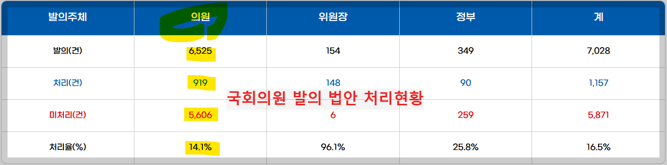 2024년 12월 31일 기준, 22대 국회에서 국회의원이 발의한 법률안은 총 6,525건이다. 단순계산으로 국회의원 1인당 평균 22건의 법안을 발의했다. 이 중 처리된 법안은 919건으로 처리율은 14.1%에 불과하다. 나머지 5,606 건은 미처리 상태로 해를 넘겼다.
