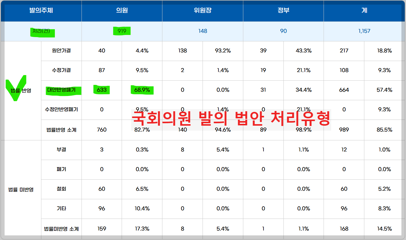 국회의원 발의 법률안 중 처리 법안 919건 가운데 68.9%에 해당되는 633건이 '대안반영폐기'로 처리되었다. 원안가결과 수정가결은 127건으로 13.9%에 불과하다. '대안반영폐기' 법안이 압도적으로 많다. 이름은 '폐기'라고 되어있지만, 대안반영폐기는 국회의원의 '처리' 실적으로 간주된다.