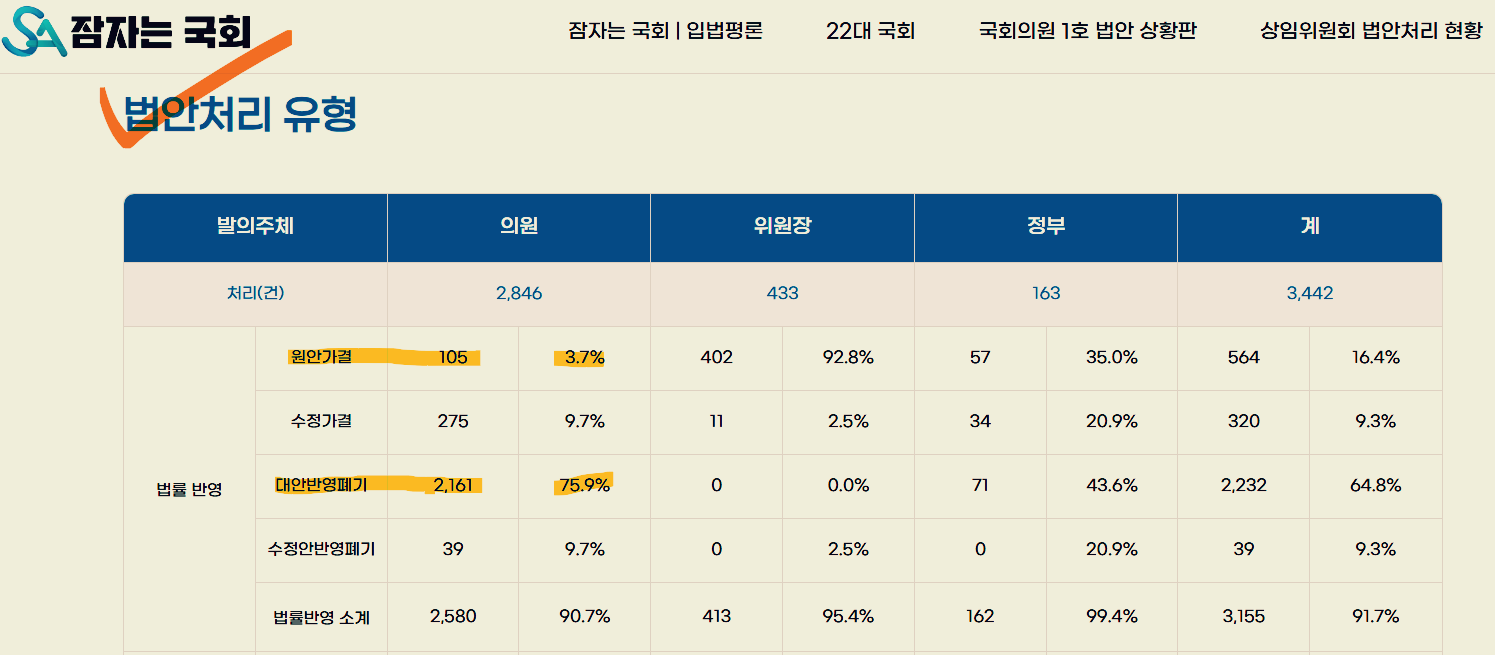 국회의원이 발의하고 본회의를 통과 즉, 처리된 법안 2,846건의 처리유형을 보면, 원안가결은 105건으로 3.7%에 불과하다. 대다수 법안은 대안반영폐기로 처리되었다. 설명하기가 좀 복잡하지만 대안반영폐기가 대다수를 차지한다는 것은 대체로 입법의 질이 높지않다는 것을 의미한다.