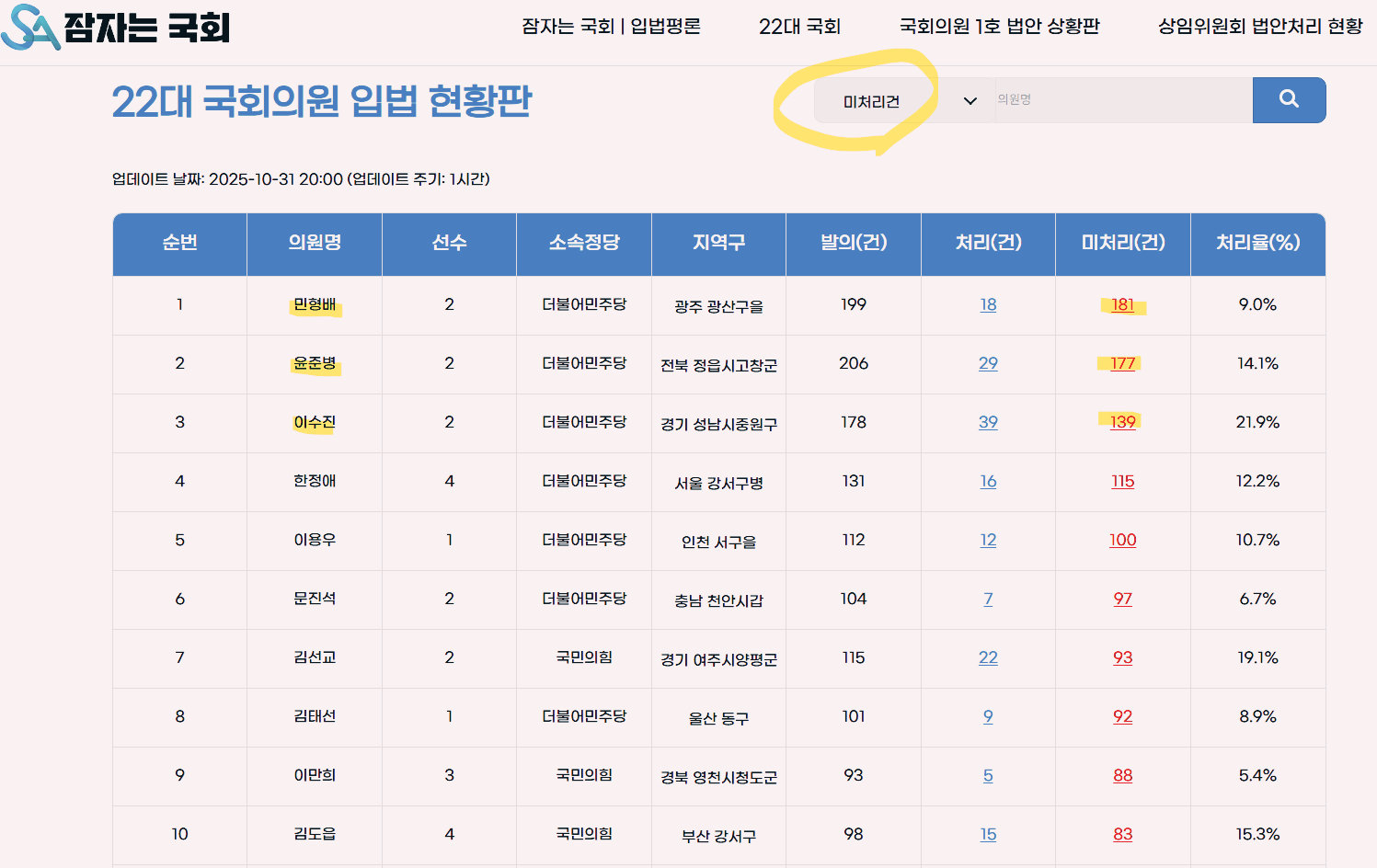 2025년 10월 말 기준 미처리법안이 가장 많은 의원은 민형배 의원 181건이다. 미처리법안은 국회의원이 대표발의한 법안 중 아직 본회의를 통과하지 못한 법안을 말한다. 2위는 윤준병 의원 177건, 3위는 이수진 의원 139건이다.
