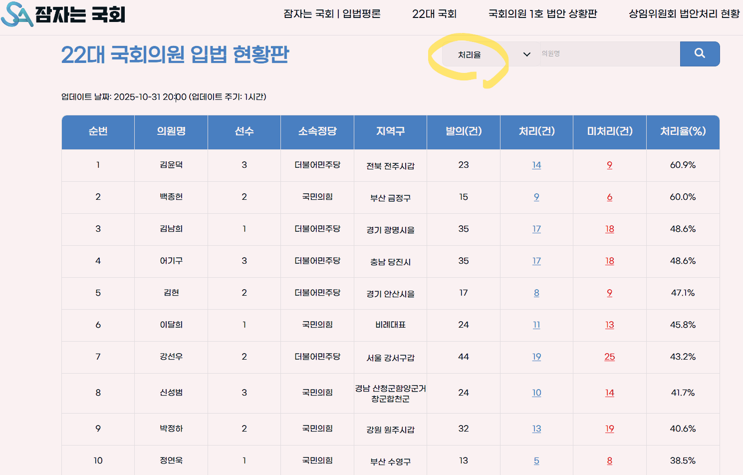 국회의원의 입법활동을 정량적으로 평가할 때 참고할 수 있는 데이터가 법안 처리율이다. 2025년 10월 말 기준 법안처리율 상위 의원은 김윤덕, 백종헌, 김남희 의원 등이다. 그러나 처리율이 높다고 해서 무조건 좋은 평가를 해서도 안된다. 이 역시 처리한 법안의 내용을 보고 평가해야 한다.