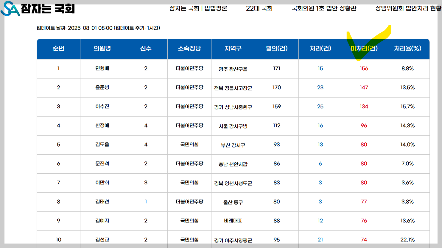 2025년 7월 말 현재 미처리법안 최다의원은 민형배(156건), 윤준병(147건), 이수진(134건) 순이다. 미처리법안이 많은 의원은 대체로 발의법안 처리율도 낮은 편이다.