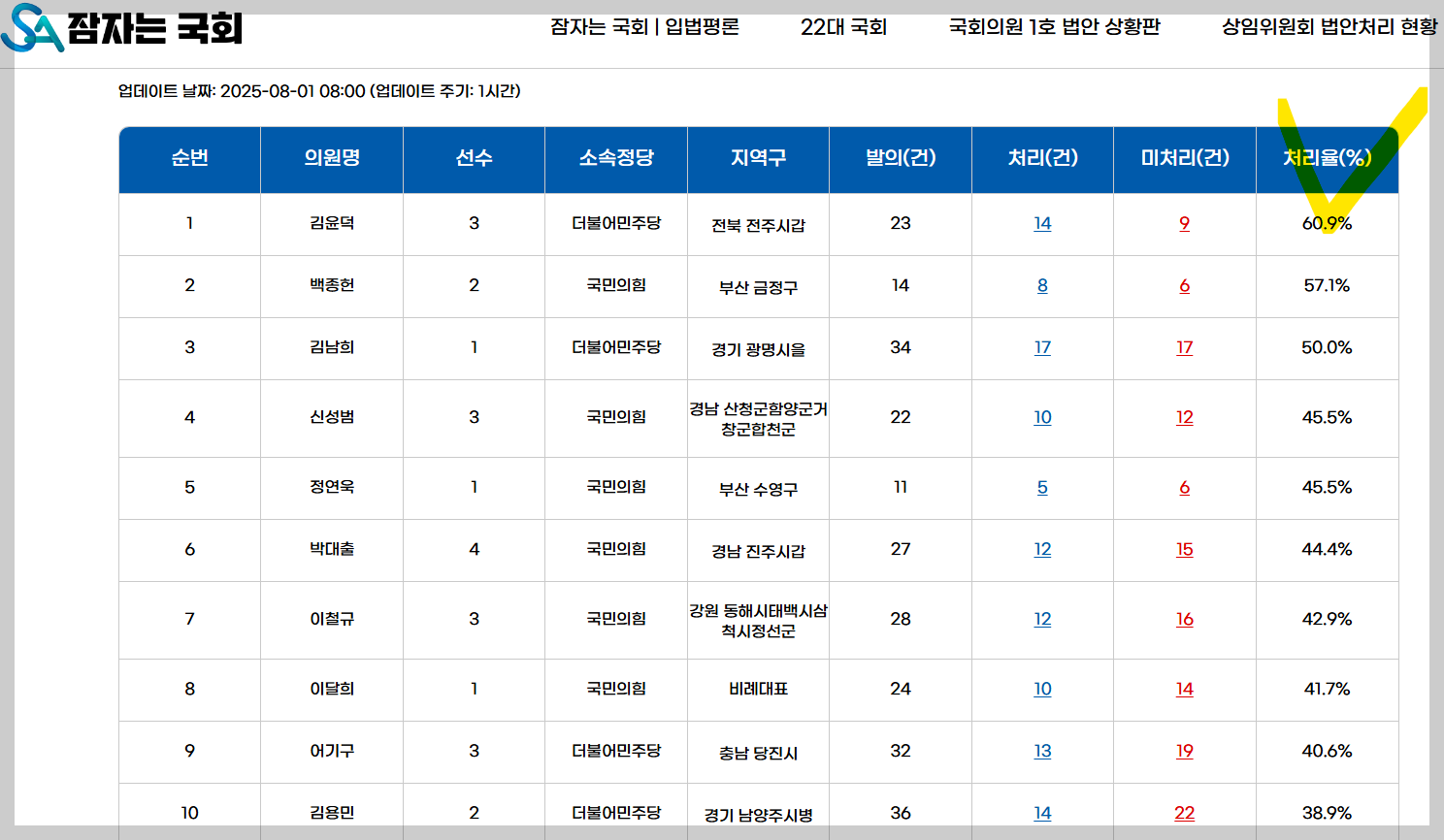 2025년 7월 말 기준 법안처리율이 가장 높은 의원은 김윤덕 의원이다. 그동안 총23건의 법안을 발의해서 현재 14건을 처리했고 처리율은 60.9%다.