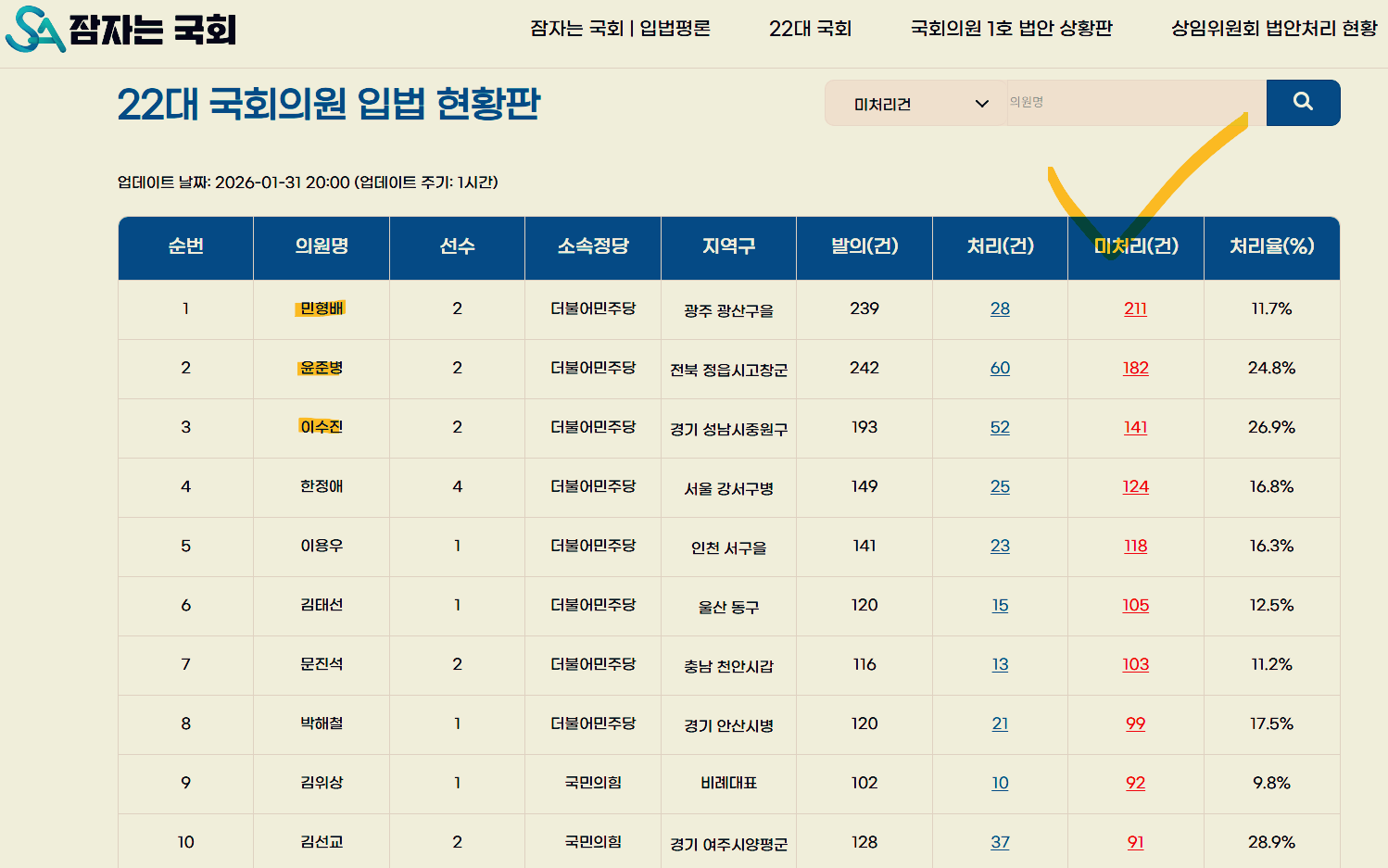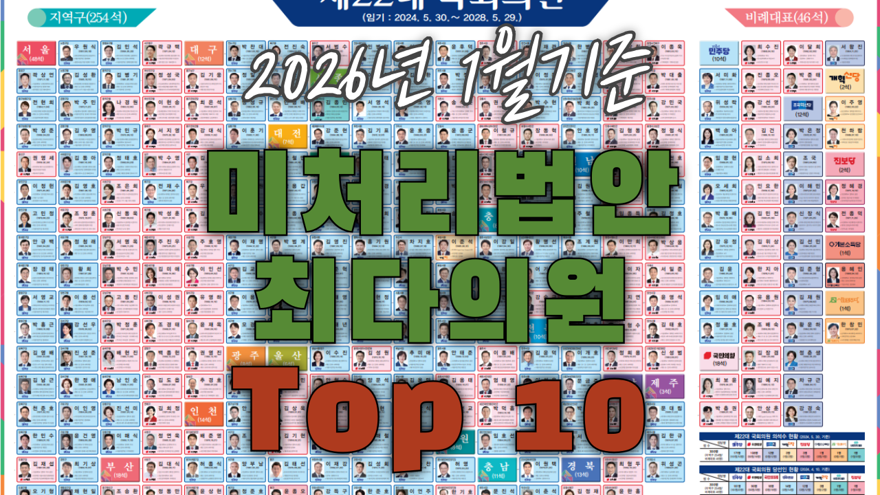 이처럼 미처리법안이 계속 쌓이는 이유는 당연히 국회의원들이 법안 발의에만 열중할 뿐 처리에 소홀하기 때문이다. 2026년 1월 말 기준 미처리 법안이 가장 많은 상위 10명의 의원은 아래 표와 같다.