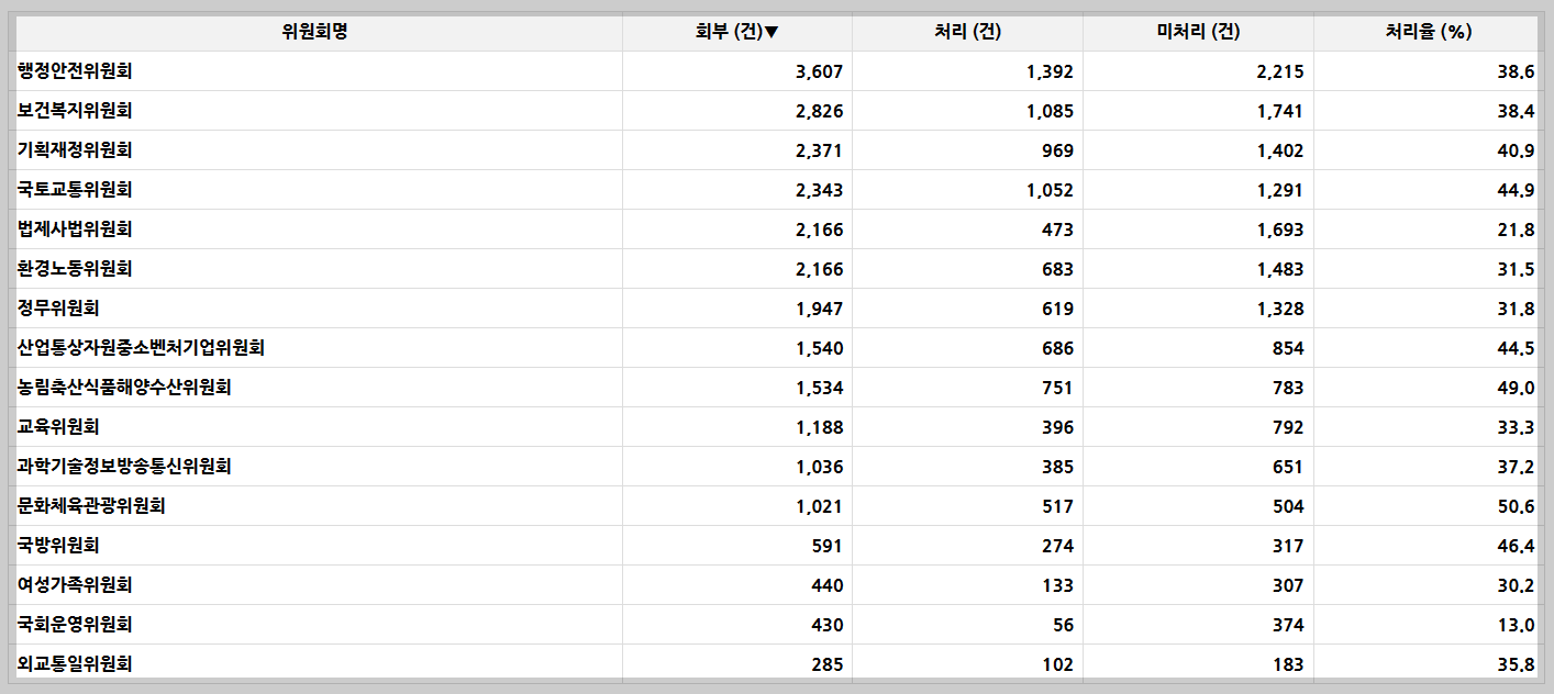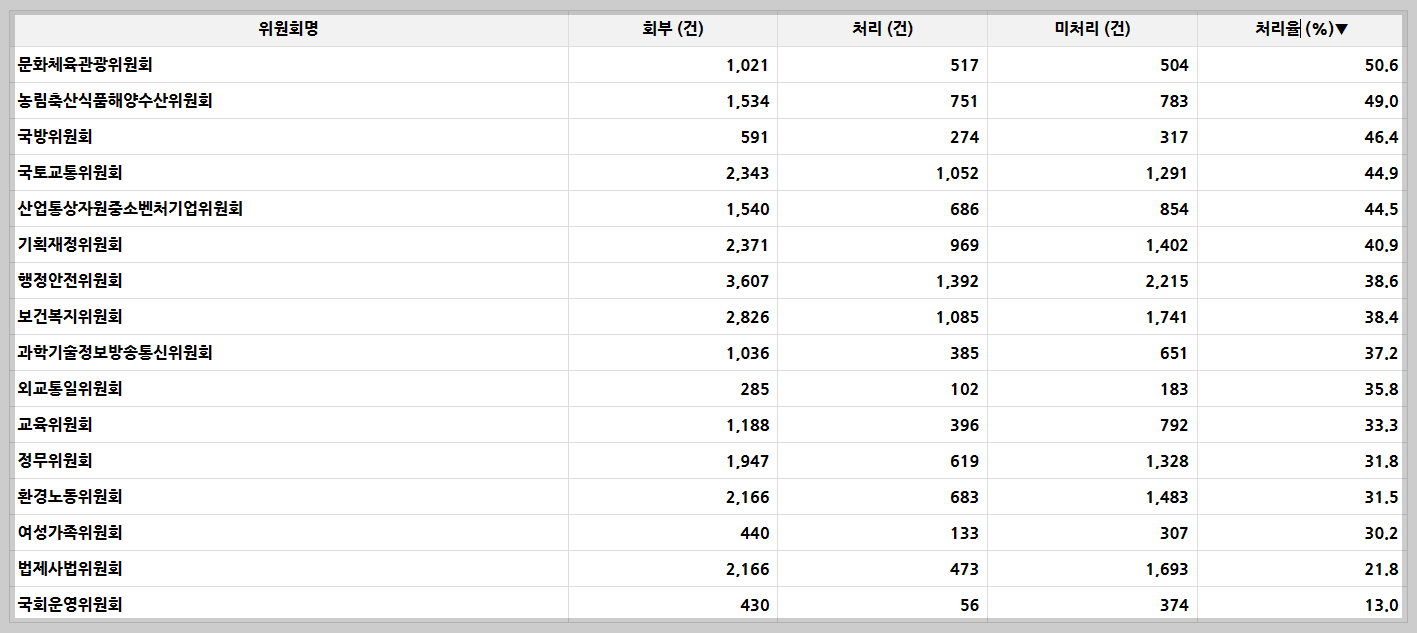 위원회마다 소관 법안 건수가 천차만별이다. 그래서 위원회별 법안처리율이 상임위 성적을 평가하는데 가장 합리적인 기준으로 보인다. 처리율이 가장 높은, 반대로 가장 낮은 위원회는 어디일까?