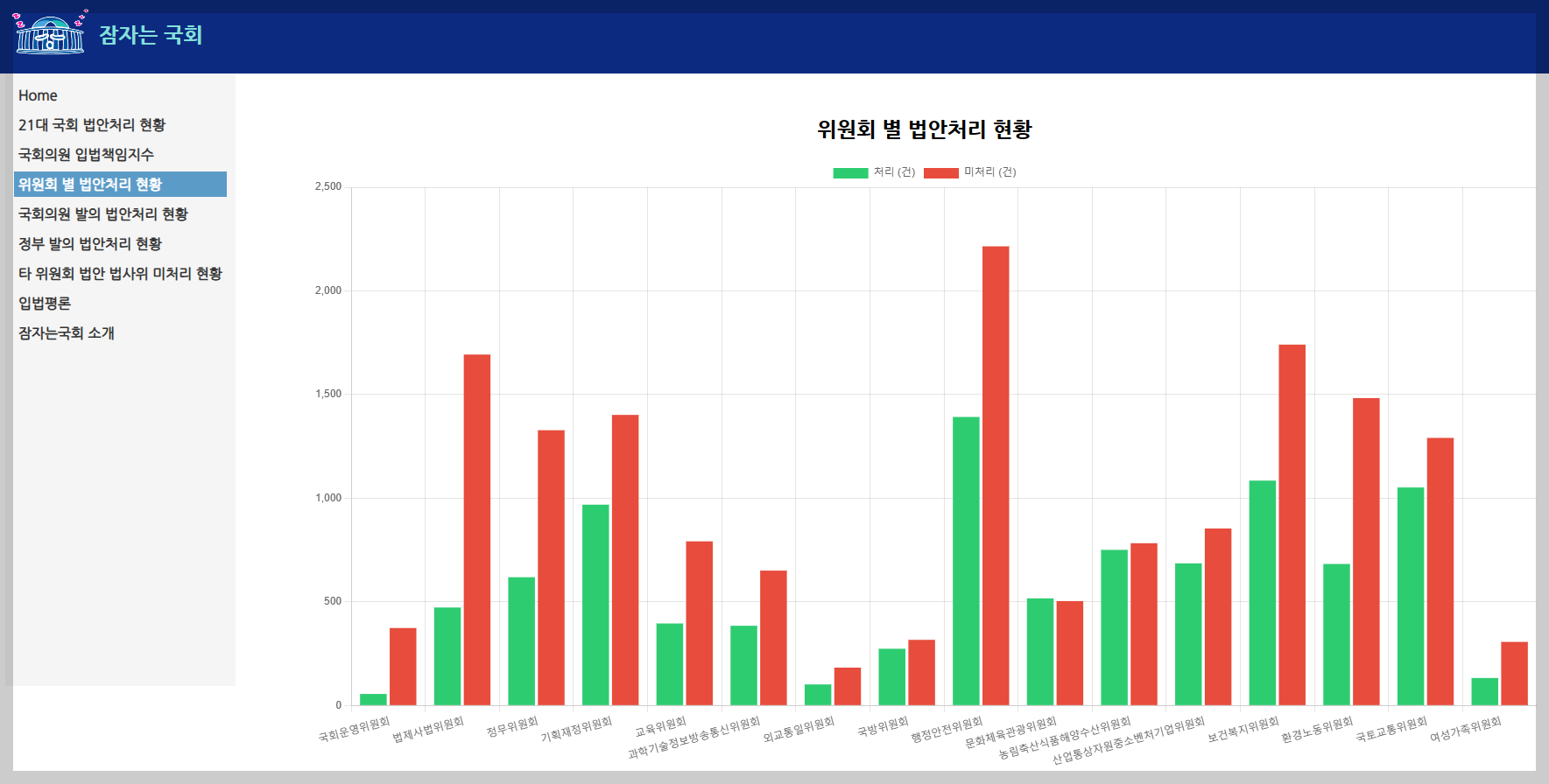 위 그래프는 국회의원 입법 데이터 대시보드 「잠자는 국회」에서 제공하는 상임위별 법안처리 현황이다. green은 처리 건수, red는 미처리 건수다. ☞자세히보기☜