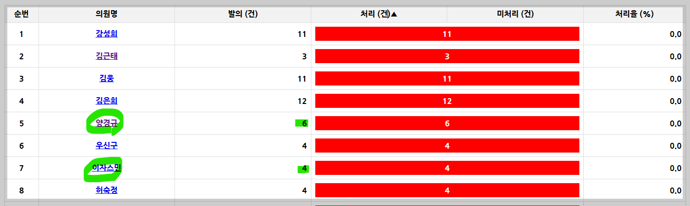 아래 표는 21대 국회 임기종료가 임박한 상황에서 법안을 발의한 의원들의 간략한 입법실적이다. 몇가지 눈에 띄는 법안 중심으로 살펴보자.