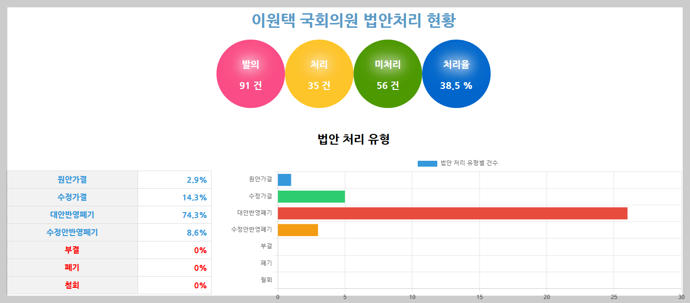 이원택 의원은 21대국회에서 91건의 법안을 발의하여 35건을 처리했다. 처리율은 38.5%다.