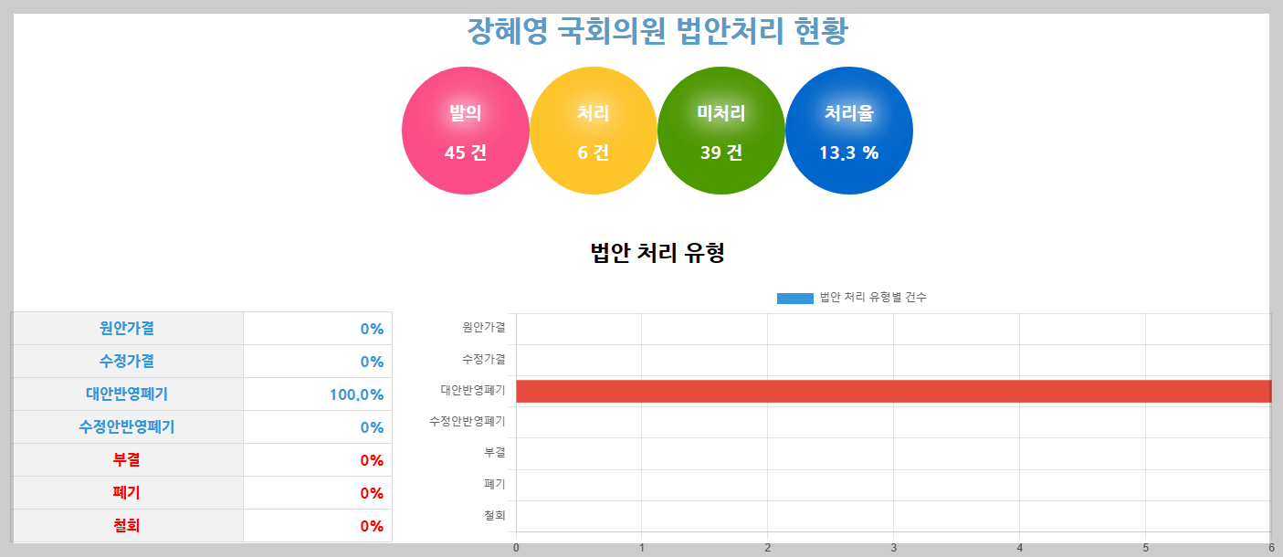 장혜영 의원은 21대 국회에서 총 45건의 법안을 발의하여 6건을 처리했다. 처리율을 13.3%다.
