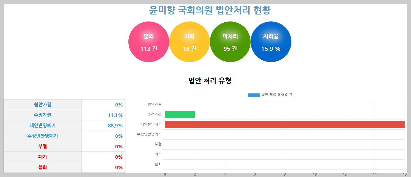 윤미향 의원은 21대국회에서 총 113건의 법안을 발의했다. 이 중 18건을 처리했고, 나머지 95건은 국회의원 임기만료와 함께 폐기된다. 발의법안 통과율은 15.9%다.