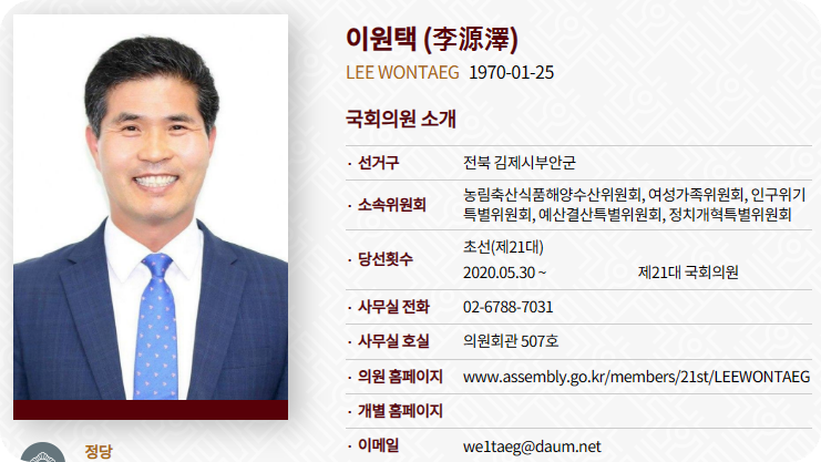 | 이원택 | 2 | 새만금사업 추진 및 지원에 관한 특별법 일부개정법률안 | 초선(전북김제) | 당선 |