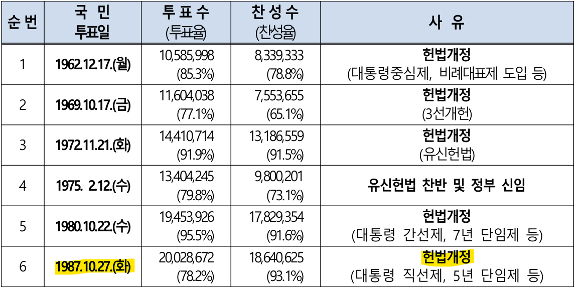국민투표법에 따라 시행된 국민투표는 지금까지 총 6번이다. 5번은 개헌을 위한 투표였고, 1번은 유신헌법 신임을 위한 국민투표였다. 87년 헌법 개정을 위한 국민투표 이후 국민투표를 실시한 사례가 없다.