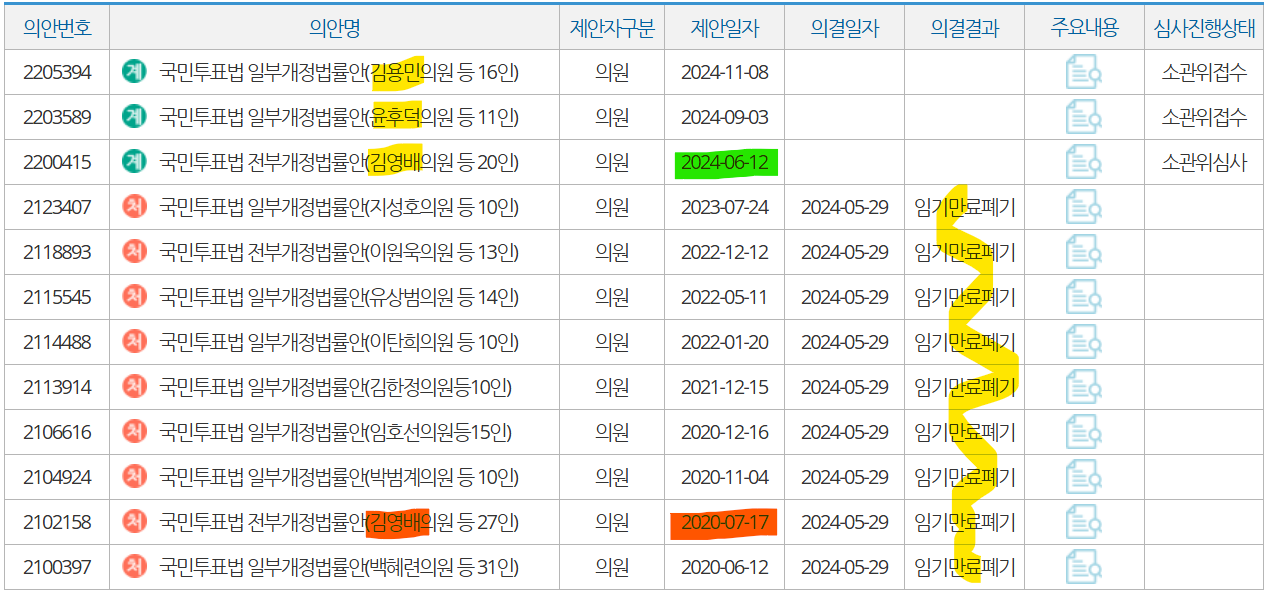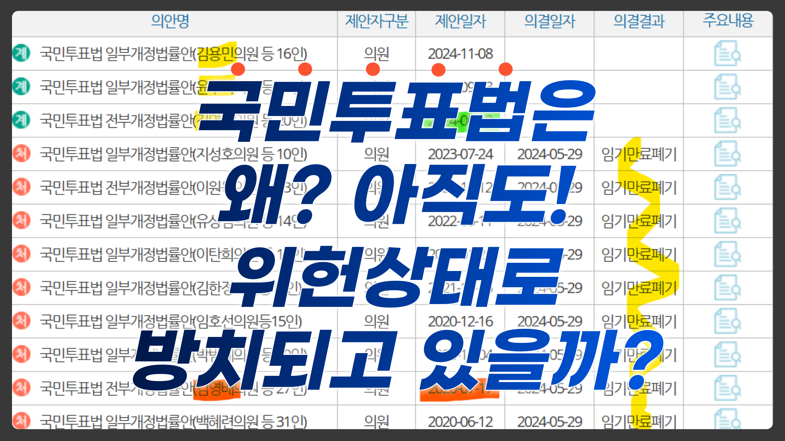 이게 좀 미스테리다. 위헌 결정이 났고, 법 개정과 관련된 특별한 쟁점도 없었다. 법안도 많이 발의됐다. 진즉에 했어야 하는데 여태 미루고 있다. 왜 그랬을까? 국민투표를 할 일이 없었기 때문이다. 그리고 국민투표법 개정은 개헌의 시그널로 읽히는 측면이 있다. 그래서 그냥 방치하고 미루어 온 것으로 추정된다.
