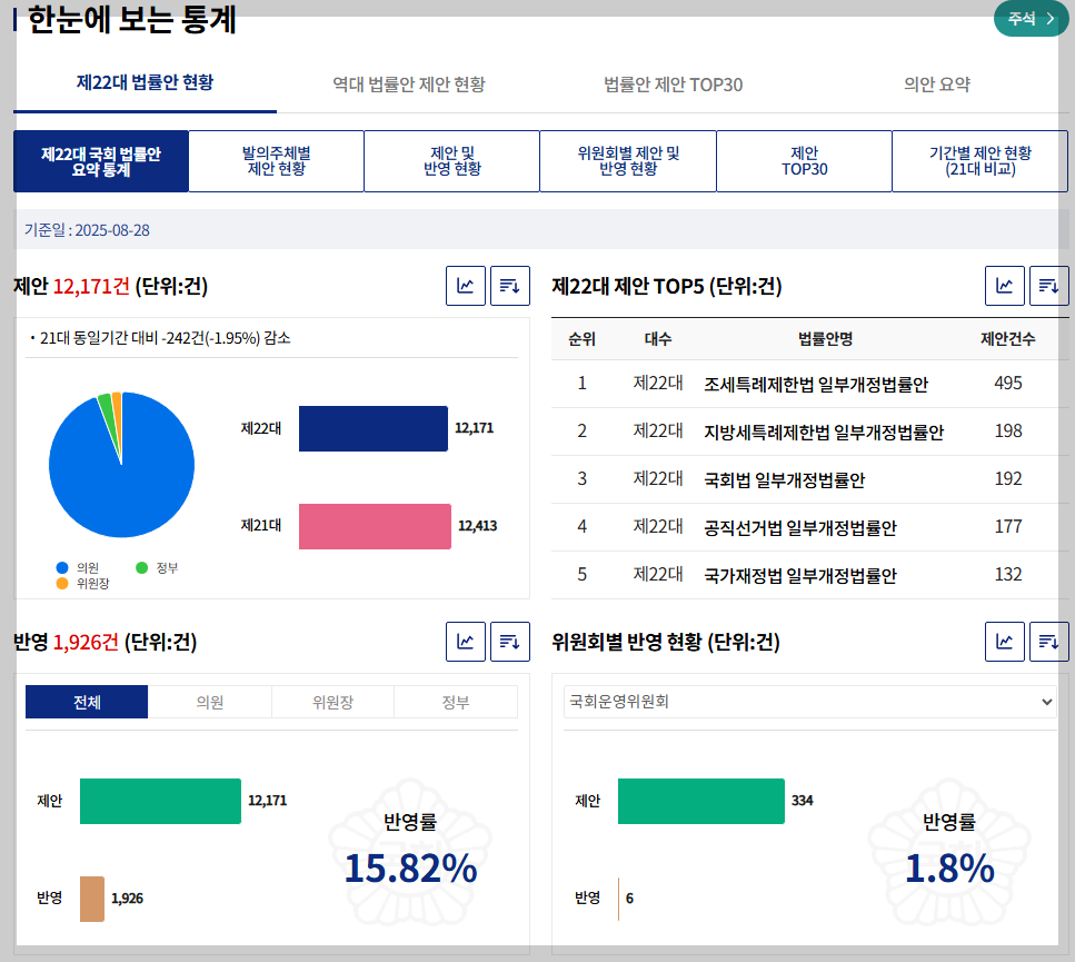 이번에 의안정보시스템을 리뉴얼 하면서 가장 많이 바뀐 부분인데, 나름 의미가 있다. 우선 이전 국회(21대)와 비교해서 이번 국회(22대)의 제안(발의) 건수를 시각화해서 보여주고 있다. 반영(률)도 핵심적으로 보여줘야할 지표다.