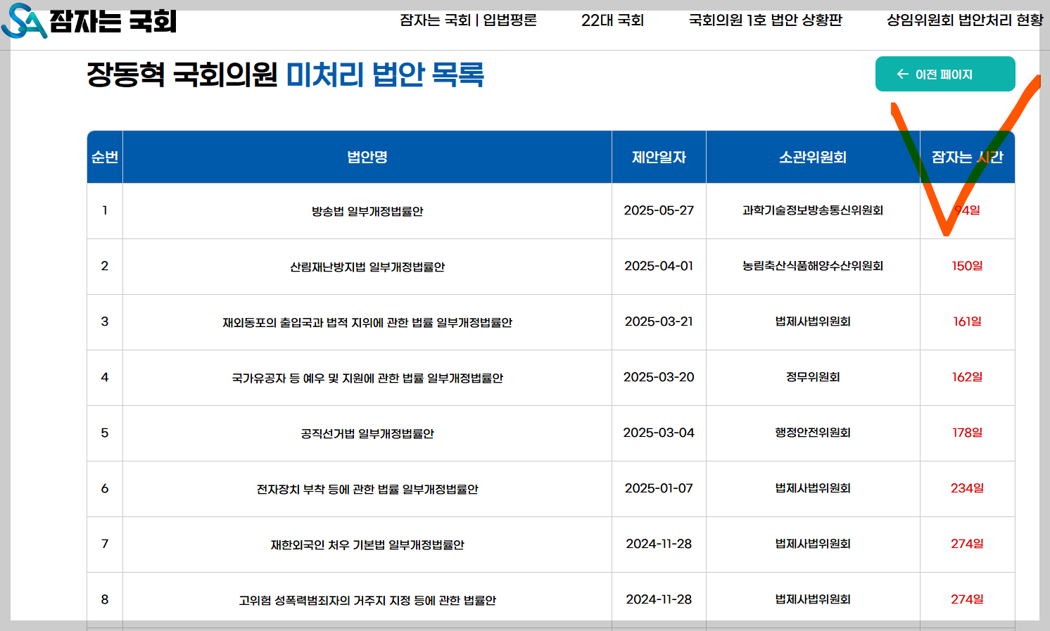 또한 잠자는국회에서는 국회의원이 발의한 법안이 얼마나 오랫동안 처리되지 못하고 방치되고 있는지를 '잠자는 시간'으로 보여준다. [잠자는국회]라는 사이트의 제목도 이 부분을 강조하기 위해서 붙힌 이름이다.